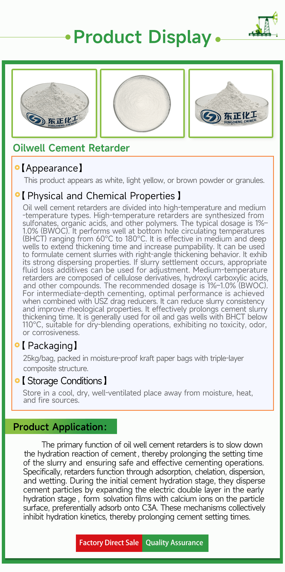 [Application] The primary function of oil well cement retarders is to slow down the hydration reaction of cement, thereby prolonging the setting time of the slurry and ensuring safe and effective cementing operations. Specifically, retarders function through adsorption, chelation, dispersion, and wetting. During the initial cement hydration stage, they disperse cement particles by expanding the electric double layer in the early hydration stage, form solvation films with calcium ions on the particle surface, preferentially adsorb onto C3A. These mechanisms collectively inhibit hydration kinetics, thereby prolonging cement setting times.