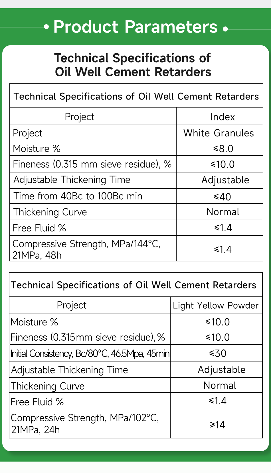 [Physical and Chemical Properties] Oil well cement retarders are divided into high-temperature and medium-temperature types. High-temperature retarders are synthesized from sulfonates, organic acids, and other polymers. The typical dosage is 1%–1.0% (BWOC). It performs well at bottom hole circulating temperatures (BHCT) ranging from 60℃ to 180℃. It is effective in medium and deep wells to extend thickening time and increase pumpability. It can be used to formulate cement slurries with right-angle thickening behavior. It exhibits strong dispersing properties. If slurry settlement occurs, appropriate fluid loss additives can be used for adjustment. Medium-temperature retarders are composed of cellulose derivatives, hydroxyl carboxylic acids, and other compounds. The recommended dosage is 1%–1.0% (BWOC). For intermediate-depth cementing, optimal performance is achieved when combined with USZ drag reducers. It can reduce slurry consistency and improve rheological properties. It effectively prolongs cement slurry thickening time. It is generally used for oil and gas wells with BHCT below 110℃, suitable for dry-blending operations, exhibiting no toxicity, odor, or corrosiveness.